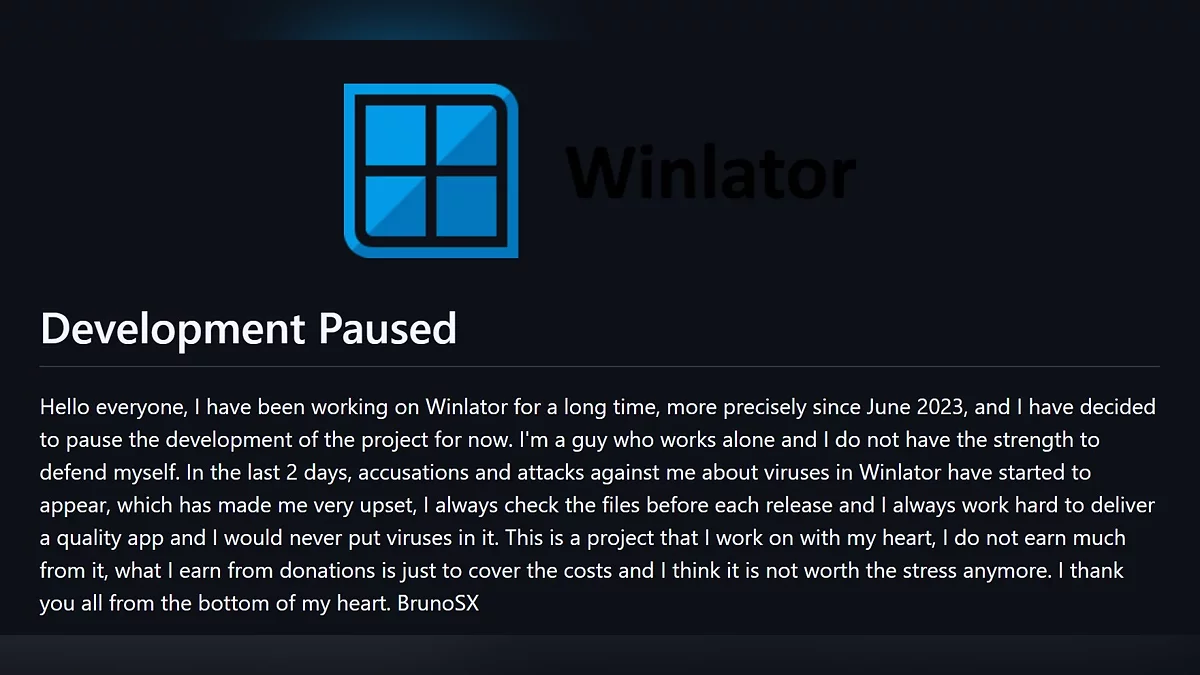 Однако в конце апреля 2025 года BrunoSX сообщил на GitHub, что прекращает поддержку Winlator. Причиной стали обвинения пользователей в наличии вирусов в установочных файлах. Разработчик опроверг эти заявления, подчеркнув, что каждый релиз проверяется антивирусами, а его команда «работает над чистотой проекта».