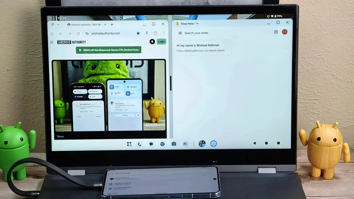 Google готовит полноценный десктопный режим для Android. Журналист Мишаал Рахман (Mishaal Rahman) показал раннюю версию функции на Pixel-устройстве — пока в режиме для разработчиков. При подключении смартфона к монитору интерфейс Android меняется: внизу появляется панель с закреплёнными приложениями, историей запущенных программ и кнопками навигации. Верхняя часть экрана отображает время, уровень сигнала и другие статус-иконки. Окна приложений можно свободно перемещать, менять их размер и располагать рядом — как в настольных ОС.