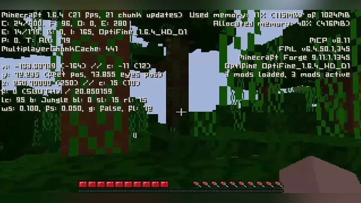 Следующей целью стала версия 1.6.4. Игра загружалась, но выдавала 1 кадр в секунду и через пару минут зависала. Чтобы добиться хоть какой-то стабильности, пришлось отключить облака, туман, анимации, снизить разрешение до минимума и использовать текстуры размером 8×8 пикселей. Даже генерацию мира перенесли на отдельный ноутбук, разгрузив основную систему.
