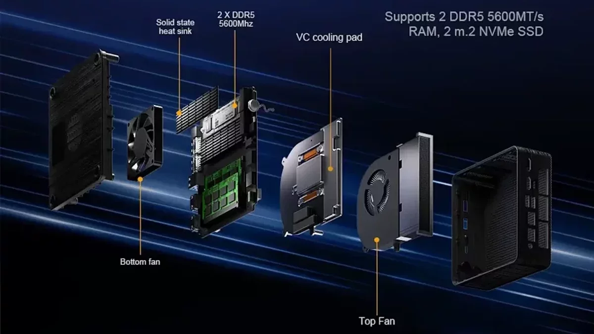 AN4 поддерживает до 64 ГБ оперативной памяти DDR5 (два слота) и два NVMe-накопителя формата M.2. В комплектацию также входят Wi-Fi 6, Bluetooth 5.2, два порта HDMI и два разъёма Ethernet 2.5G. Из минусов — отсутствие OCuLink, который редко встречается в устройствах этой ценовой категории. Корпус из алюминия сохраняет компактные размеры и совместим с креплением VESA для монтажа за монитором. Теплоотвод обеспечивают два вентилятора и испарительная камера, что должно снижать перегрев даже при высокой нагрузке.