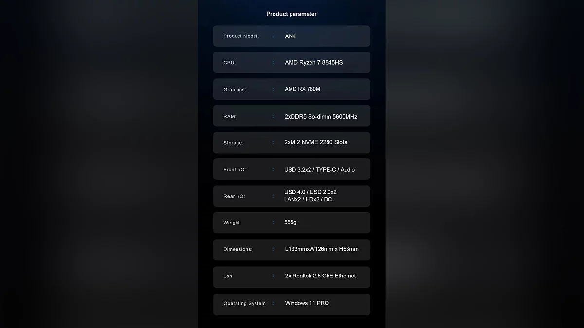 Китайский бренд Chatreey анонсировал мини-компьютер AN4 на базе процессора AMD Ryzen 7 8845HS. Устройство позиционируется как бюджетное решение для тех, кто ищет баланс между производительностью и ценой. Сердцем системы стал 8-ядерный чип из серии Hawk Point с интегрированной графикой Radeon 780M. Этого достаточно для запуска современных игр в Full HD на низких или средних настройках. Для более требовательных задач предусмотрен порт USB4, позволяющий подключить внешнюю видеокарту.