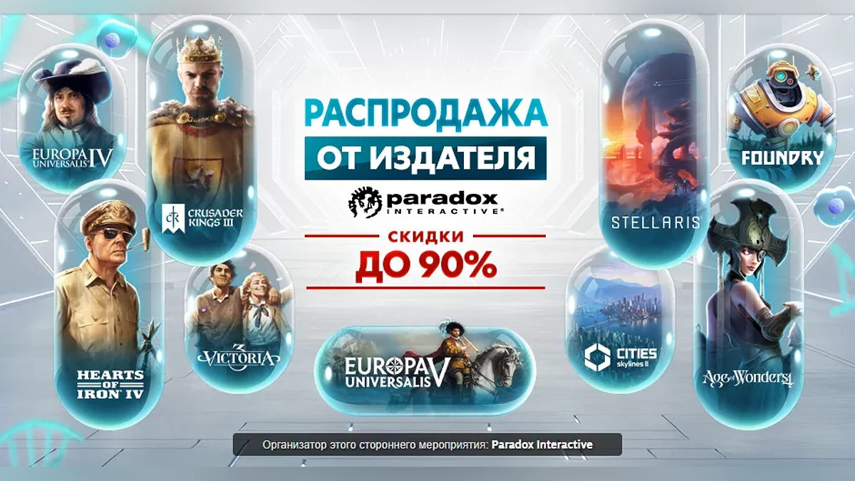 Издатель Paradox Interactive запустил в сервисе Steam распродажу, которая продлится до 15 мая 20:00 по московскому времени. Полный список скидов можно найти на странице акции.