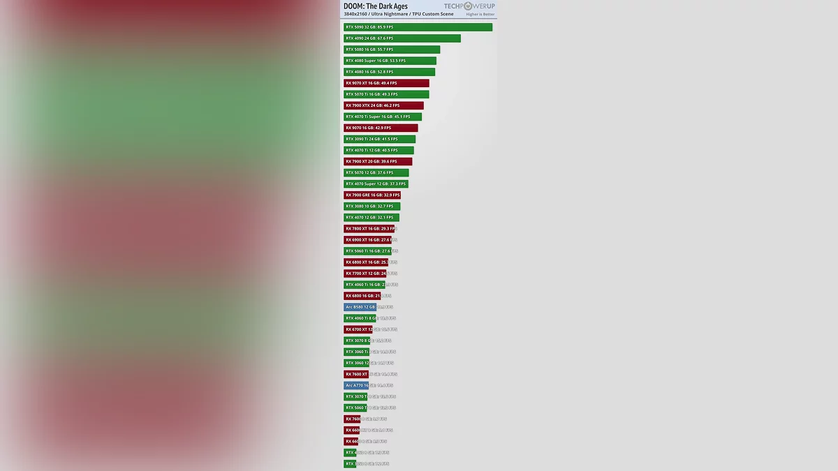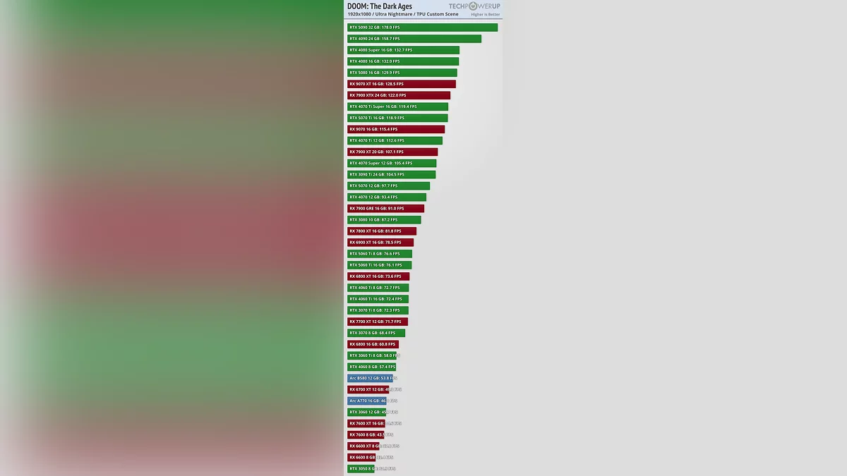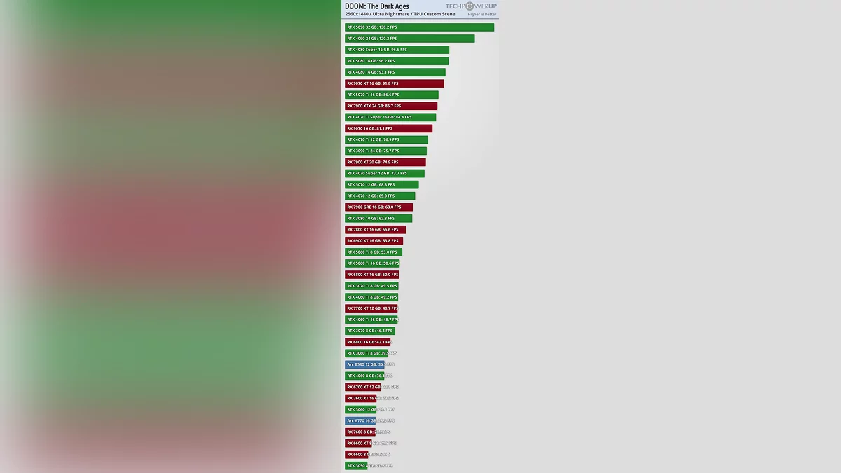 Портал TechPowerUp протестировал Doom: The Dark Ages на 40 разных видеокартах от NVIDIA, AMD и Intel. Игра запускалась с максимальными настройками графики в разрешениях 1080p, 2K и 4K.