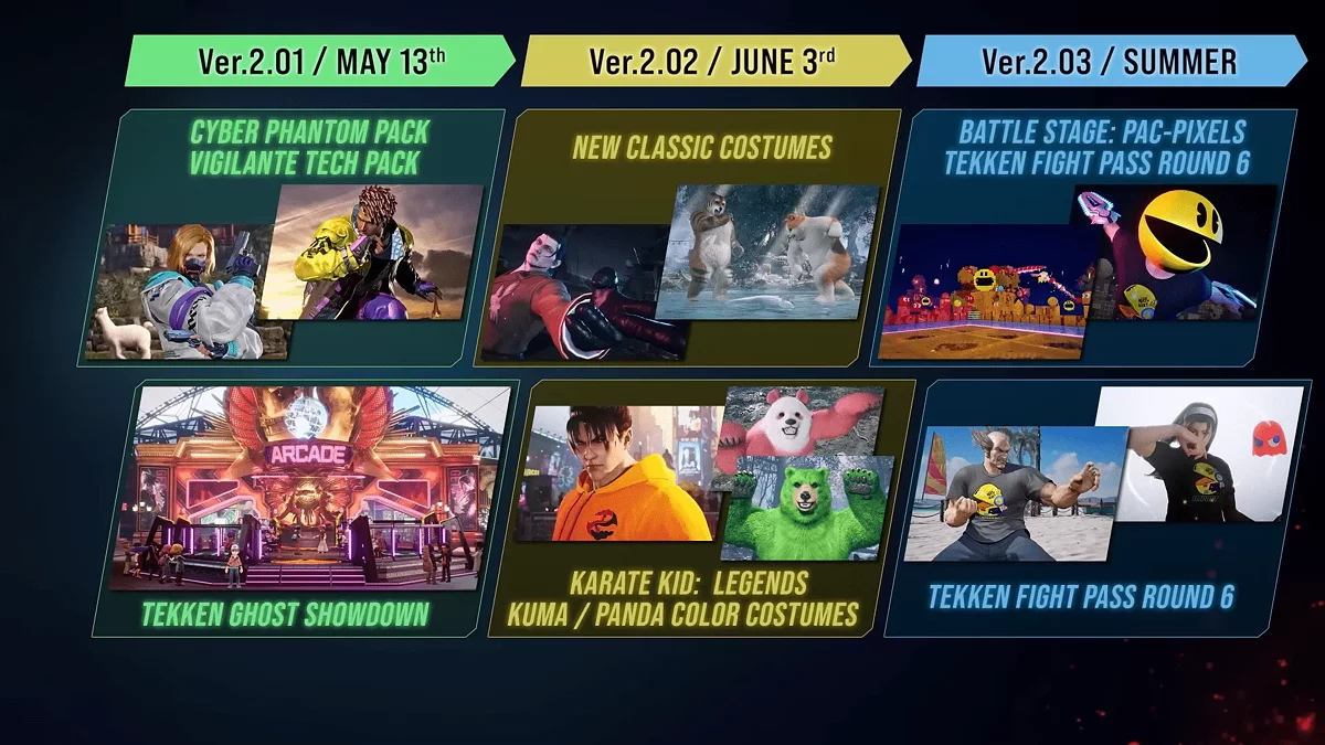 13 мая игра получит обновление 2.01, которое добавит режим Tekken Ghost Showdown и два платных набора (Cyber Phantom Pack и Vigilante Tech Pack). 3 июня выйдет патч 2.02. Игроков ждут коллаборация с фильмом «Каратэ-пацан: Легенды» и новые классические костюмы. Обновление 2.03 выйдет до конца лета. Оно запустит коллаборацию с Pac-Man и добавит Fight Pass Round 6.