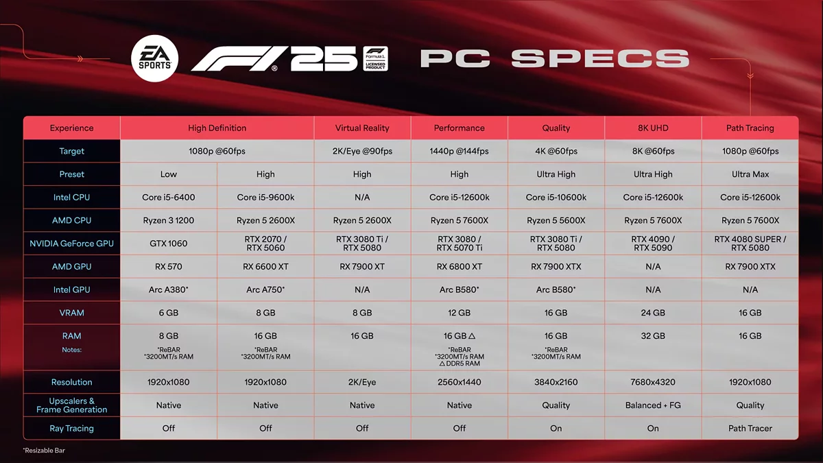 Компания Electronic Arts опубликовала в сети расширенные системные требования компьютерной версии гоночного симулятора F1 25, над которым трудится студия Codemasters.