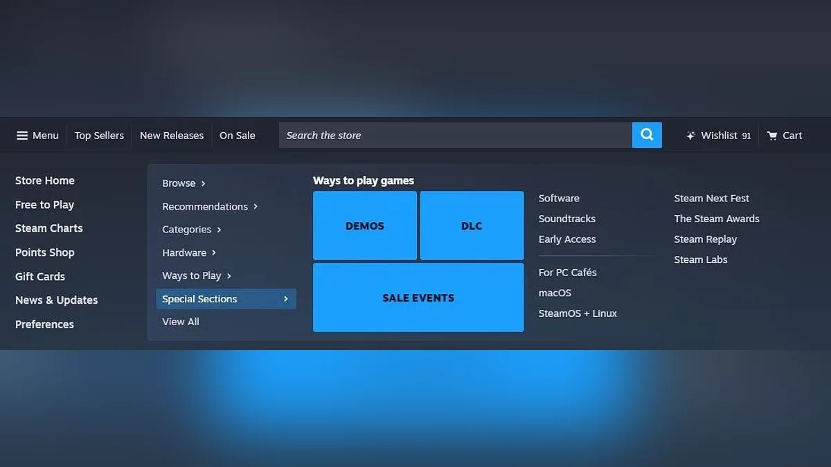 Улучшения коснулись главной страницы сервиса. Дизайнеры переместили поисковую строку, сделали её больше и заметнее, добавили новые подразделы в контекстном меню. «Способы игры» позволят найти тайтлы для Steam Deck и VR, а в «Специальных разделах» можно будет найти саундтреки, софт и другие сторонние продукты.