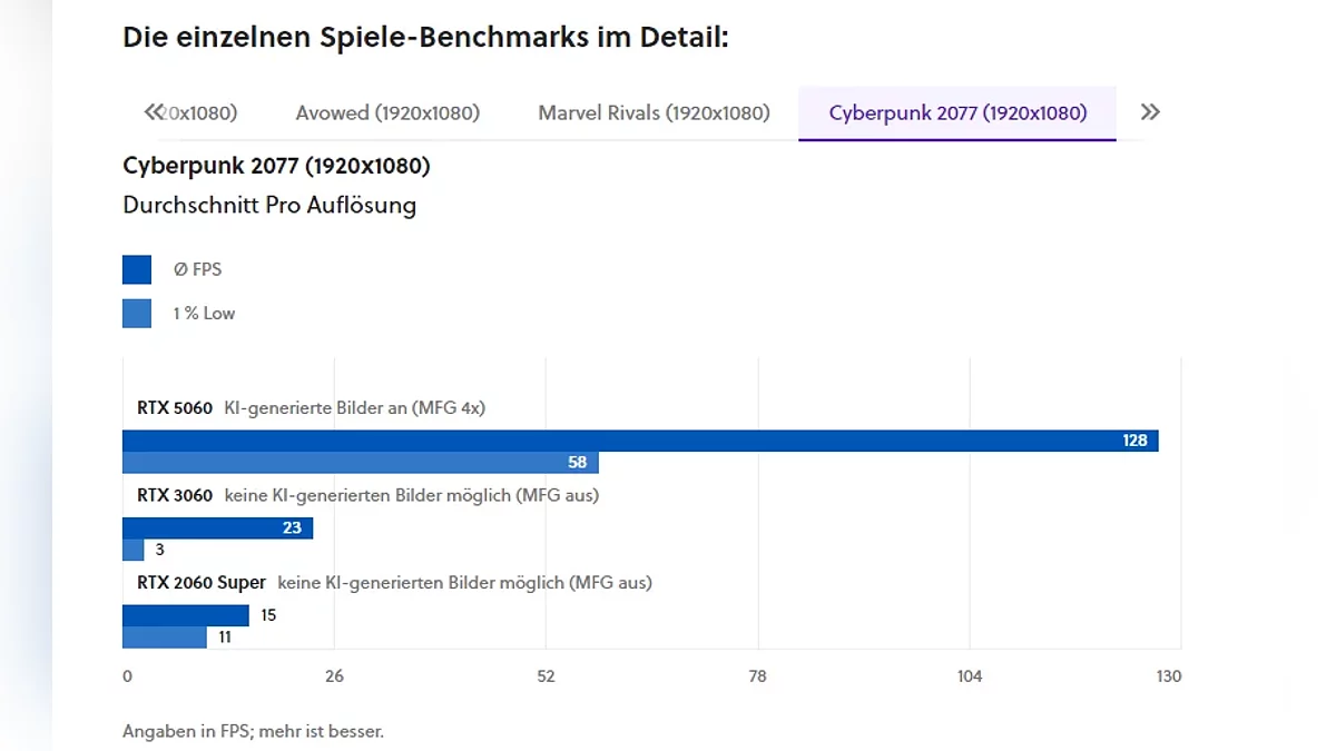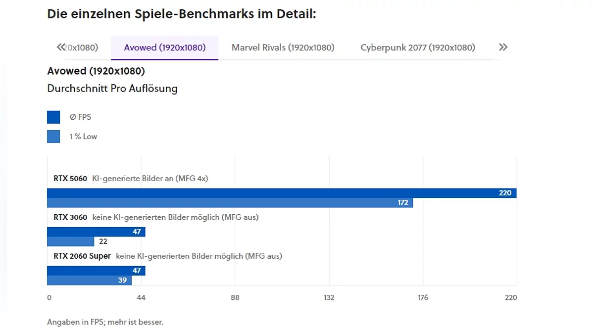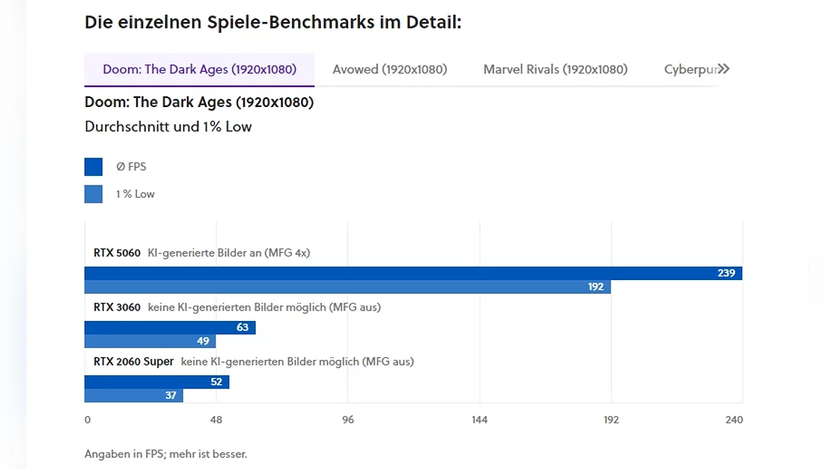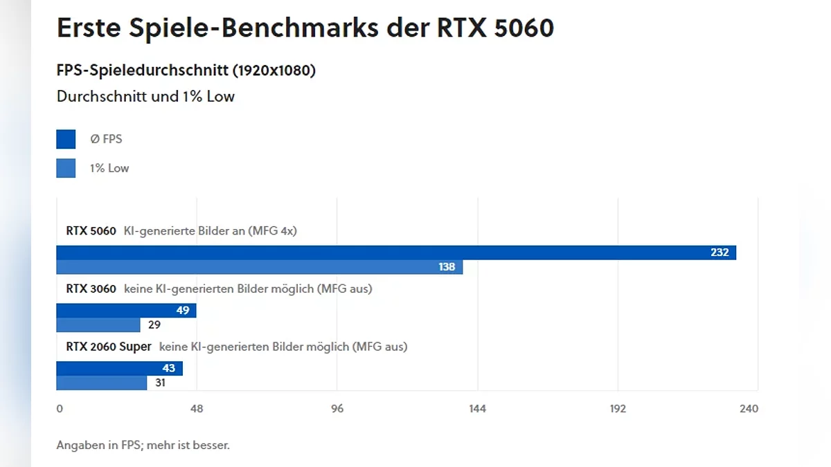 Как выяснилось, в предварительных материалах RTX 5060 демонстрирует до 232 кадров/с в играх, однако такой результат достигается исключительно за счет MFG, искусственно увеличивающего FPS. Без этой функции производительность падает ниже 60 кадров/с, что, по мнению экспертов PCGamesHardware, стало бы очевидным в независимых тестах. При этом сравнение с прямым конкурентом — RTX 4060 — и видеокартами AMD полностью исключено, что ставит под сомнение объективность представленных данных.