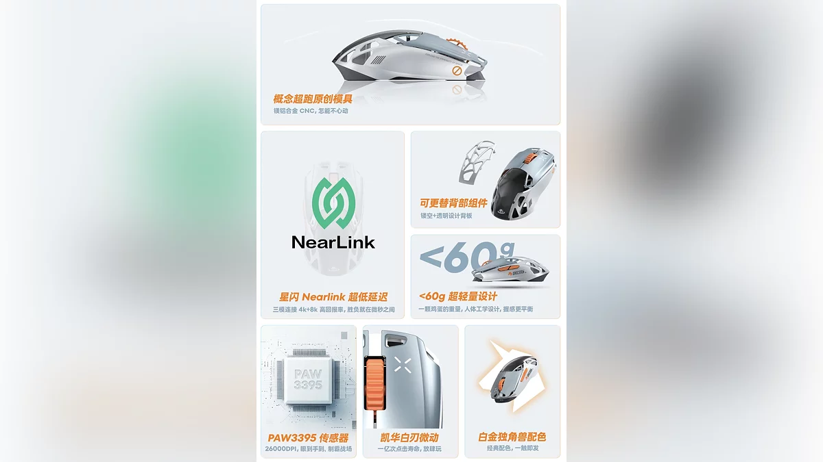 Модель оснащена сенсором PixArt PAW3395 с максимальной чувствительностью 26 000 DPI и контроллером HiSilicon BS25 для точного отслеживания движений. Для снижения задержки до 0,125 мс используется технология StarFlash NearLink, которая также обеспечивает стабильное соединение даже в беспроводном режиме. Дополнительно мышь поддерживает проводное подключение.