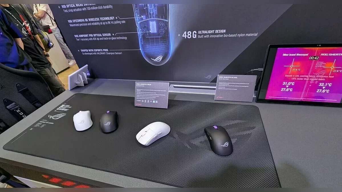 Рядом с мышью на стенде демонстрировался коврик Sheath II XXL. Его главная особенность — ткань с улучшенным теплоотводом, которая, по заявлениям ASUS, снижает температуру поверхности на 18% по сравнению с обычными аналогами. Это может быть полезно для длительных игровых сессий, когда руки пользователя склонны к потливости. Ориентировочная стоимость ROG Harpe II Ace и дата её выхода в продажу пока не раскрываются.