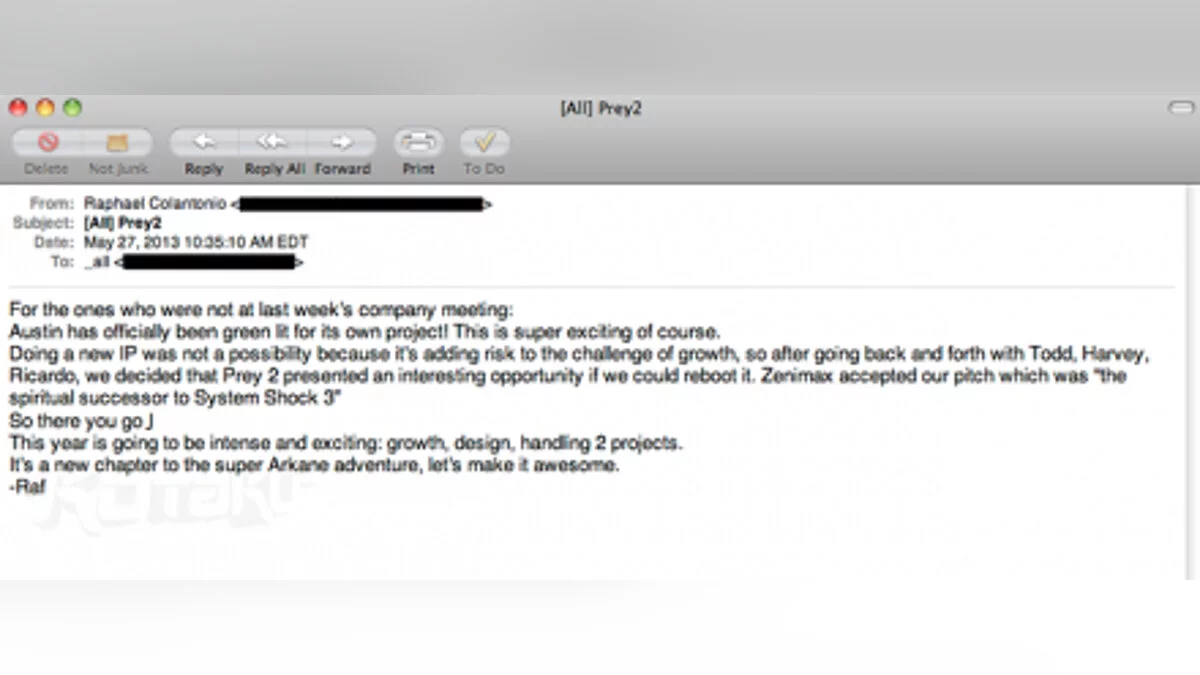 Журналистам каким-то образом удалось увидеть рабочие письма креативного директора Arkane Studios Ральфа Колантонио (Ralph Colantonio). В конце мая этого года он отослал сотрудникам остинской студии сообщение, в котором заявил, что им разрешили заняться перезагрузкой Prey 2. Игра, по его мнению, должна стать духовным наследником System Shock 3, а команда должна радоваться, что будет работать сразу над двумя проектами.