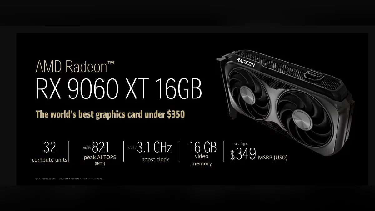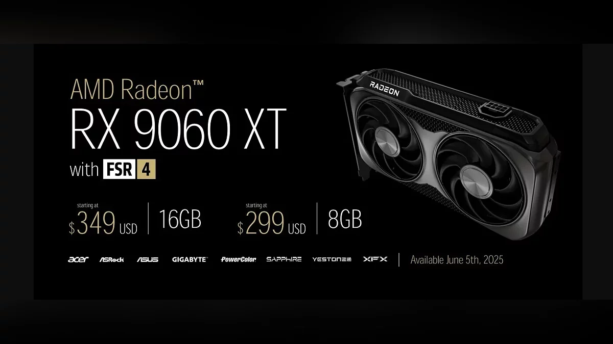 На выставке Computex 2025 компания AMD официально представила две новые модели видеокарт — Radeon RX 9060 XT с 8 ГБ и 16 ГБ памяти GDDR6. Устройства позиционируются как оптимальный выбор для игр в разрешении 1080p с максимальными настройками, включая трассировку лучей. Старшая модель оценена в $349 (около 28 000 рублей), младшая — в $299 (около 24 000 рублей), а старт продаж запланирован на 5 июня 2025 года.