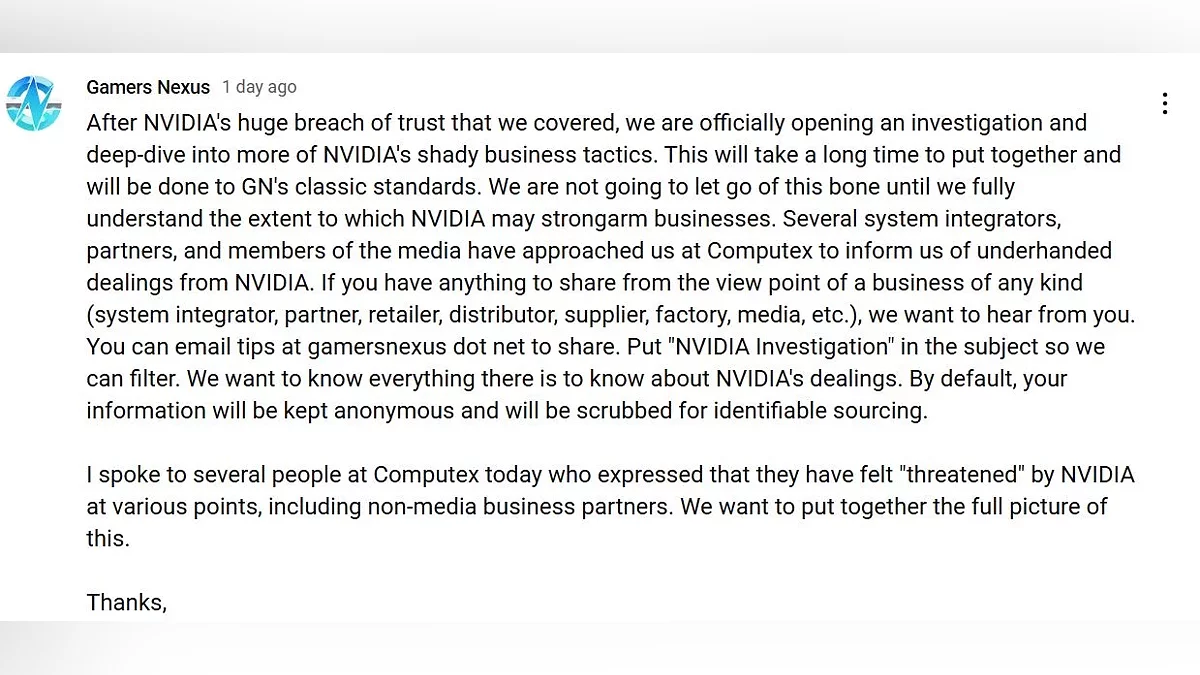 Команда популярного YouTube-канала Gamers Nexus объявила о запуске детального расследования в отношении методов работы корпорации NVIDIA. Поводом стали многочисленные жалобы от партнеров, СМИ и представителей бизнеса, которые сообщили о давлении со стороны компании.