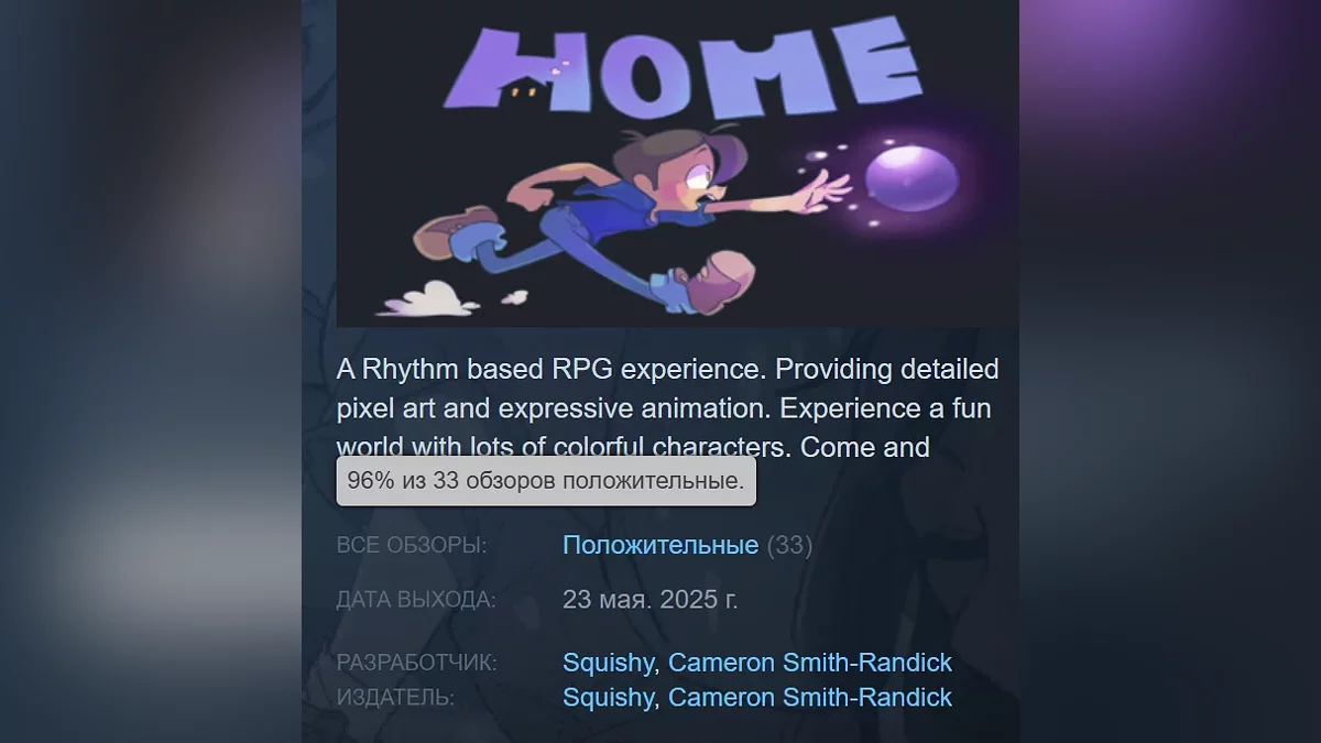 Home — пиксельная ритм-RPG о девушке Эбби и её брате Майкле, которая является бесплатным прологом находящейся в разработке Away From Home. Получила 96% рейтинга. Станица в Steam.