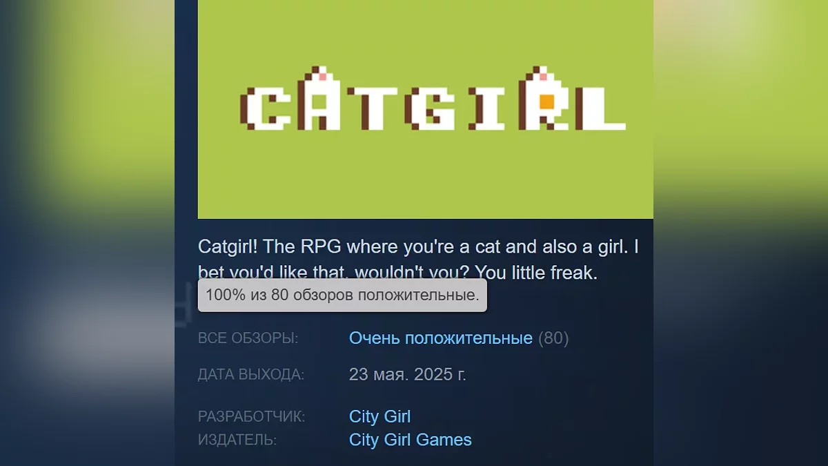 Catgirl — пиксельная RPG о девочке-кошке, которая должна спасти свою собаку, похищенную злой королевой. Игра получила 100% положительных отзывов. Страница в Steam.
