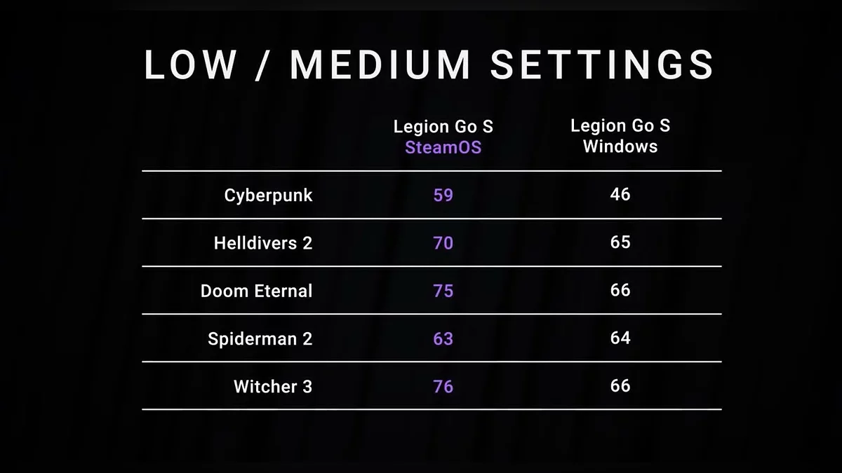 В играх вроде Cyberpunk 2077 и The Witcher 3 версия на SteamOS демонстрирует увеличение частоты кадров на 10–28% по сравнению с Windows. Например, в Cyberpunk при средних настройках FPS вырос с 46 до 59 кадров/с, а в Doom Eternal — с 66 до 76 кадров/с. Исключением стал Marvel's Spider-Man 2, где разницы между системами не обнаружилось.