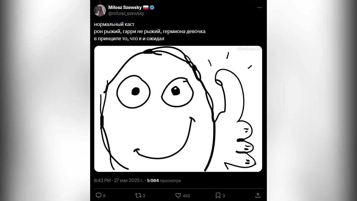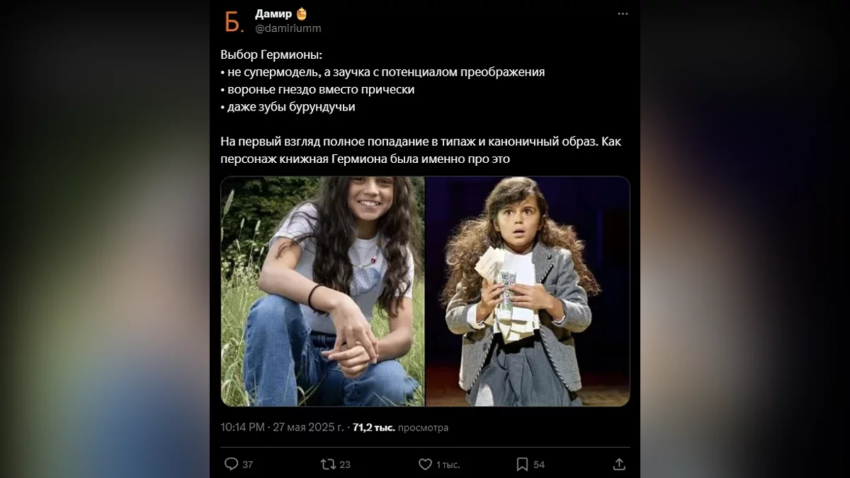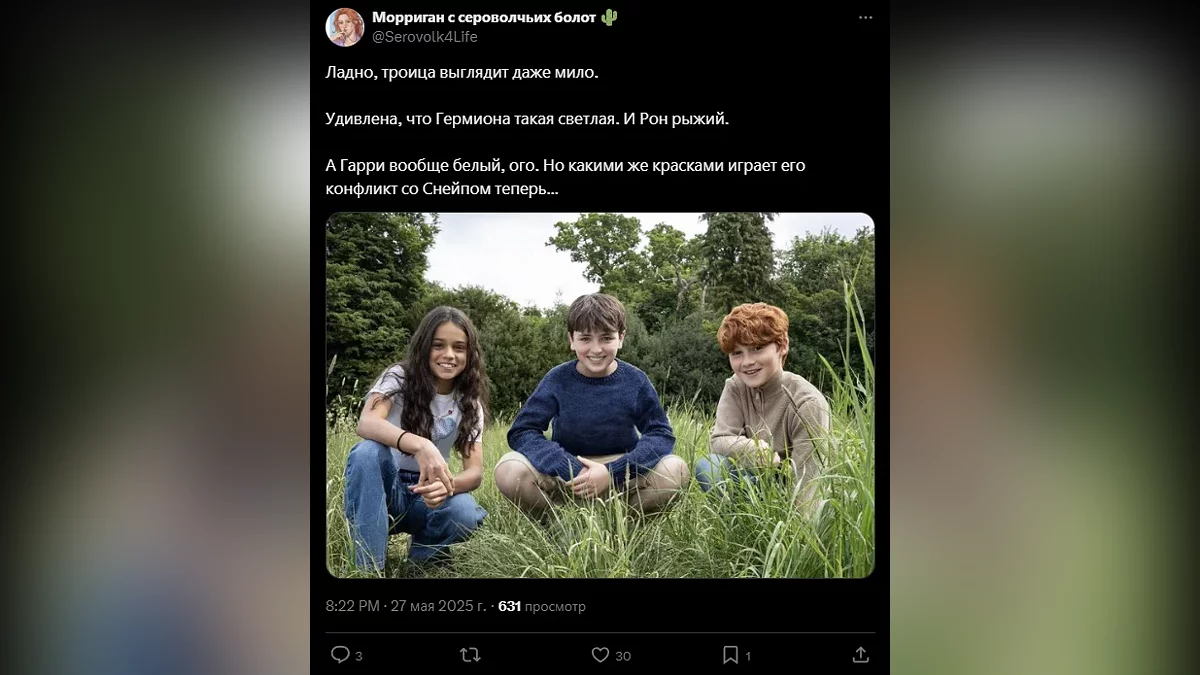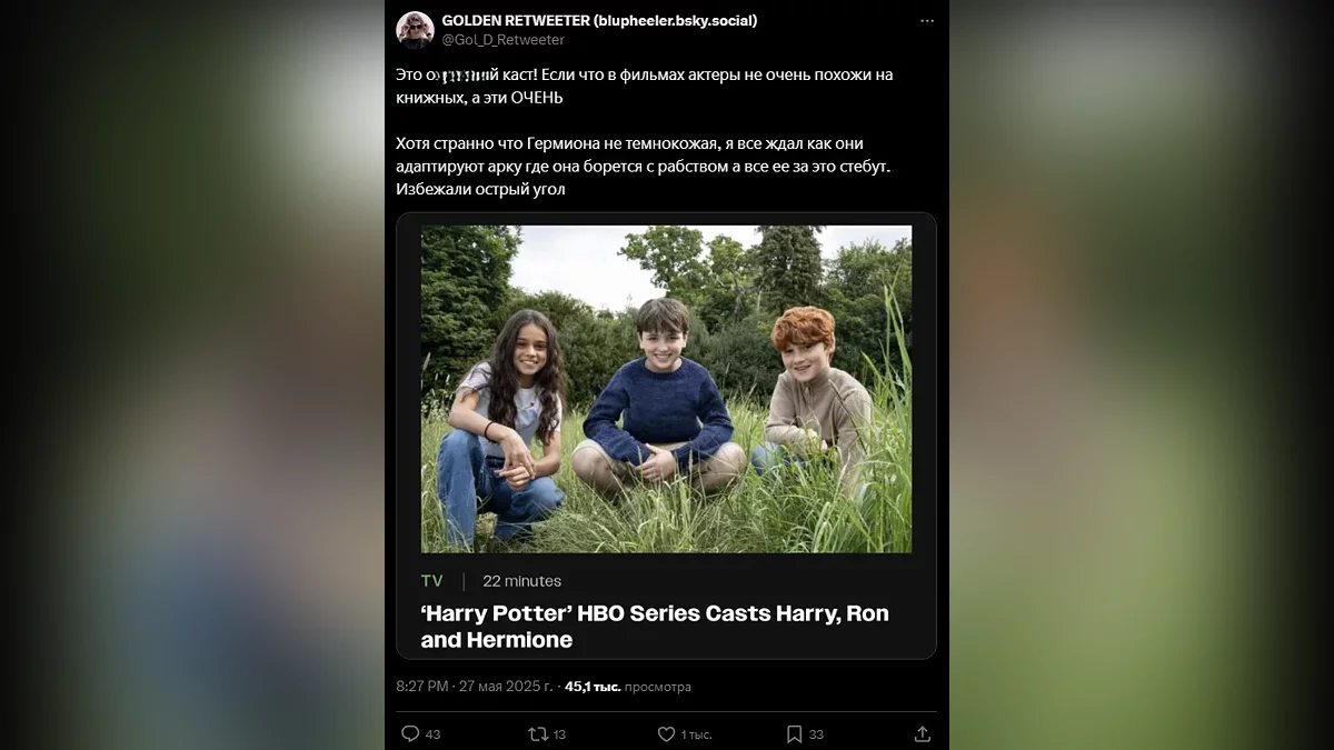 Анонс вызвал бурную реакцию в сети — большинство откликов оказались восторженными. Единственное, в чём не сошлись фанаты, — это Гермиона: одни недовольны оттенком кожи актрисы, другие, напротив, уверены, что образ выбран безупречно.