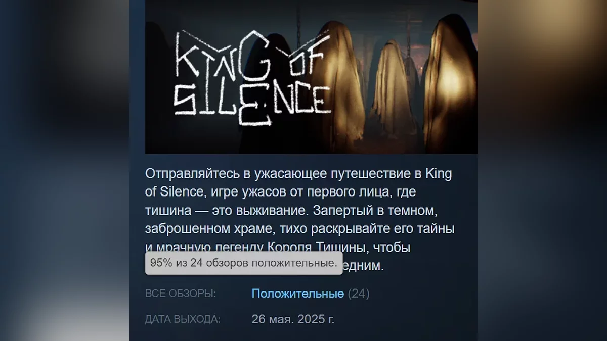 King of Silence — хоррор от первого лица о ребенке, запертом в заброшенном храме, где обитает демон, ненавидящий шум. Игра получила 95% положительных отзывов. Страница в Steam.