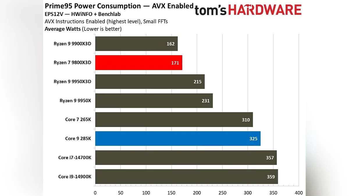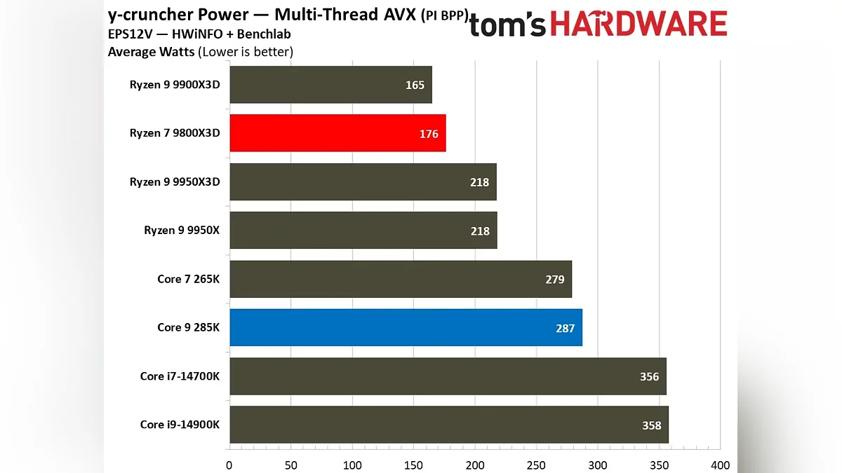 Ryzen 7 9800X3D потреблял на 63% меньше энергии в тесте y-cruncher и на 90% меньше в стресс-тесте Prime95 (AVX) под полной нагрузкой, чем синий конкурент. Это означает меньший нагрев и более тихую/доступную систему охлаждения. Также цена процессора от AMD примерно на $120 (около 9 500 рублей) ниже, а еще он совместим с существующими материнскими платами AM5 (B650/X670), тогда для Intel требуется новая плата на чипсете 800-й серии и сокете LGA1851.