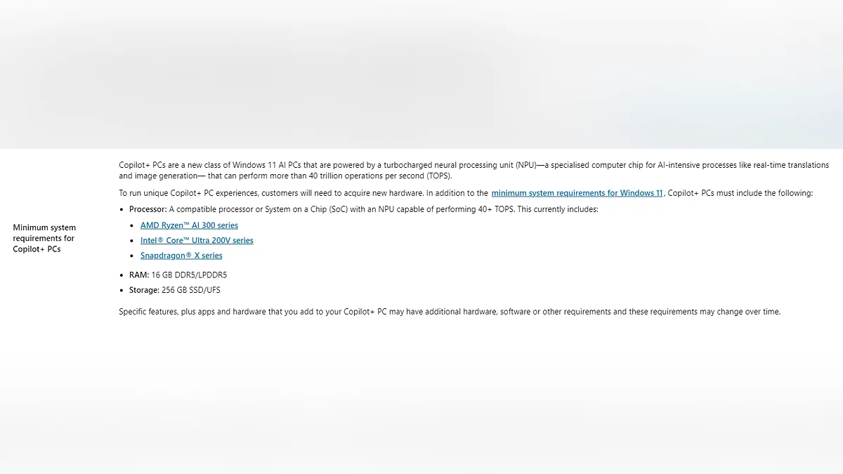 Этот шаг снимает неопределенность для пользователей, интересующихся ИИ-функциями Windows, и четко указывает, какое «железо» потребуется для их активации. Помимо процессора с мощным NPU, для запуска специфичных для Copilot+ PC функций Microsoft установила дополнительные минимальные требования к ОЗУ и SSS: 16 ГБ (стандарт DDR5 или LPDDR5) и SSD или UFS объемом не менее 256 ГБ.
