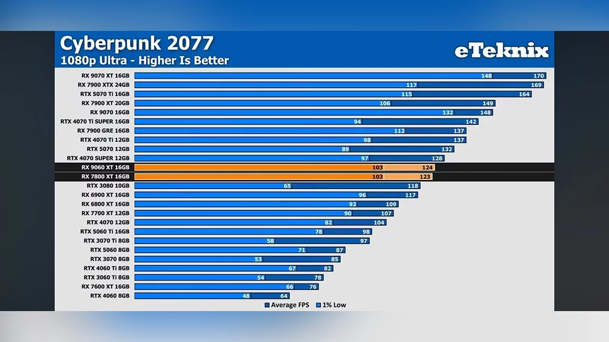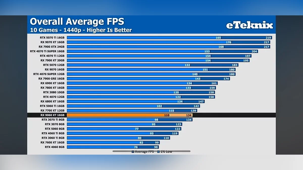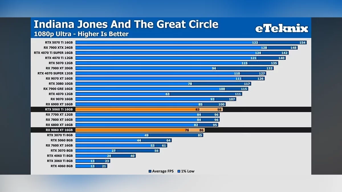 Важный момент — сравнение проводилось исключительно с 16-гигабайтной версией RTX 5060 Ti. Ранее AMD в своих материалах противопоставляла RX 9060 XT 16 ГБ именно 8-гигабайтному конкуренту, заявляя о преимуществе в 6% при 1440p Ultra. Учитывая их собственные заявления, очевидно, что компания делает ставку на позиционирование RX 9060 XT как достойного варианта для 1440p гейминга, особенно против 8 ГБ версий конкурентов, однако модель может составить конкуренцию и 16 ГБ версии RTX 5060 Ti.