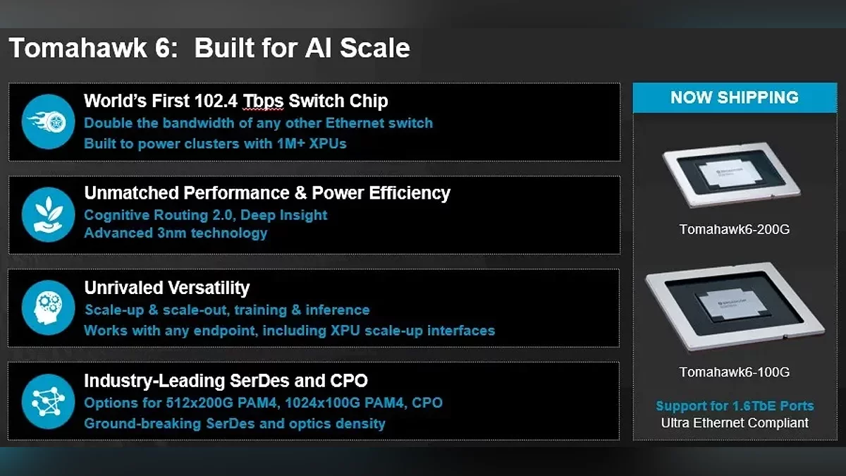 Кроме того, Broadcom подчёркивает, что использование открытого Ethernet-стека позволяет отказаться от проприетарных решений, снизить стоимость инфраструктуры и ускорить внедрение. Хотя Tomahawk 6 — это сугубо дата-центровое решение, технологии, оттачиваемые в серверных кластерах, со временем могут прийти и в потребительские сегменты. Более стабильные и быстрые сетевые соединения, более дешёвый и мощный облачный ИИ, улучшенные механизмы обработки сетевого трафика.