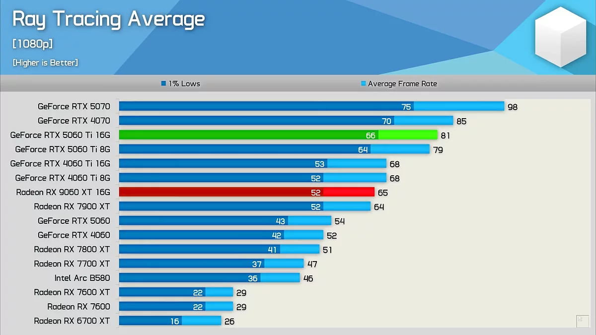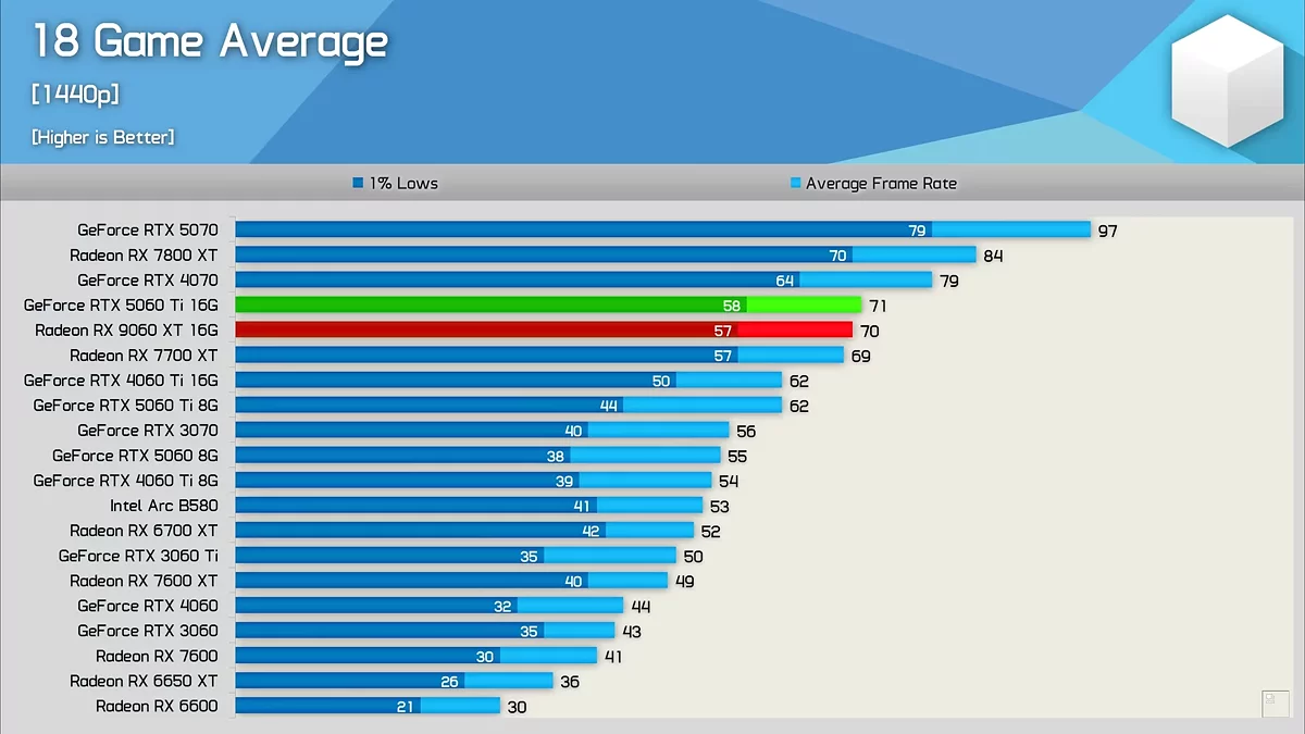 RX 9060 XT не уступает RTX 5060 Ti в 1440p, но отстает при использовании трассировки лучей