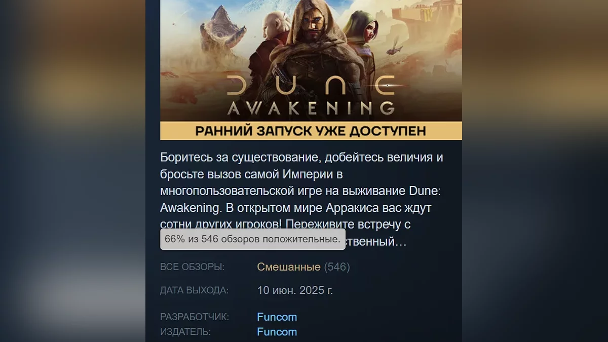 5 июня в Steam состоялся ранний релиз Dune: Awakening. Игра стала доступна обладателям изданий Deluxe и Ultimate. Геймеры сыграли в новинку и поделились своим мнением о ней.