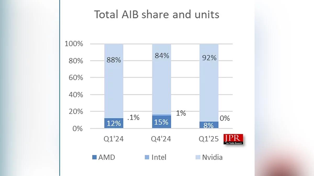 Рынок дискретных видеокарт (AIB) демонстрирует все более выраженную концентрацию вокруг одного игрока по итогам первого квартала 2025 года. Согласно свежим данным консалтинговой компании Jon Peddie Research (JPR), поставки графических адаптеров для настольных PC составили 9,2 миллиона штук.