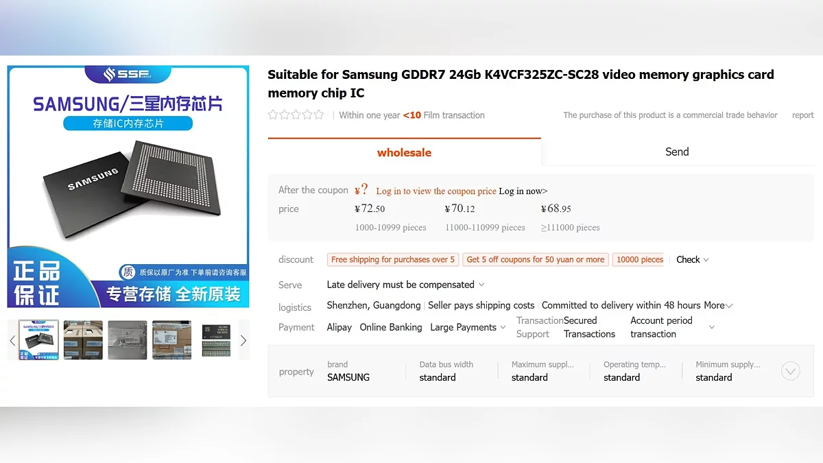 На одной из китайских торговых площадок неожиданно обнаружились в свободной продаже модули памяти Samsung GDDR7 модели K4VCF325ZC-SC28. Их особенность — нестандартный объем 3 ГБ на чип, что вдвое больше типичных для видеокарт 24-гигабитных кристаллов. Цена за штуку начинается от $10.