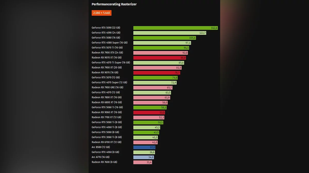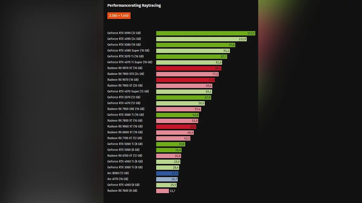 В разрешении 1440p (WQHD) без использования рейтрейсинга абсолютное первенство удерживает NVIDIA GeForce RTX 5090. Новый флагман опередил прошлое поколение (RTX 4090) примерно на 16%, а младшую модель RTX 5080 — на 35%. Примечательно, что предыдущий топ AMD, Radeon RX 7900 XTX, показал результат всего на 2% хуже свежей RTX 5070 Ti и даже на 4% обогнал новинку RX 9070 XT от «красных».
