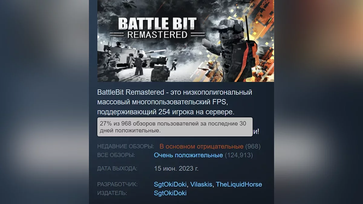 BattleBit Remastered — выпущенный в раннем доступе многопользовательский шутер от первого лица с управляемым транспортом, разрушаемыми картами и боями на 254 игрока. Игра платная — в России стандартное издание стоит 690 рублей. Из-за отсутствия нового контента игроки забросили шутер — последние три месяца пиковый онлайн не превышал 1500 человек в Steam. Кроме того, за последние 30 дней игра получила 27% положительных отзывов (общий рейтинг проекта равен 84%).