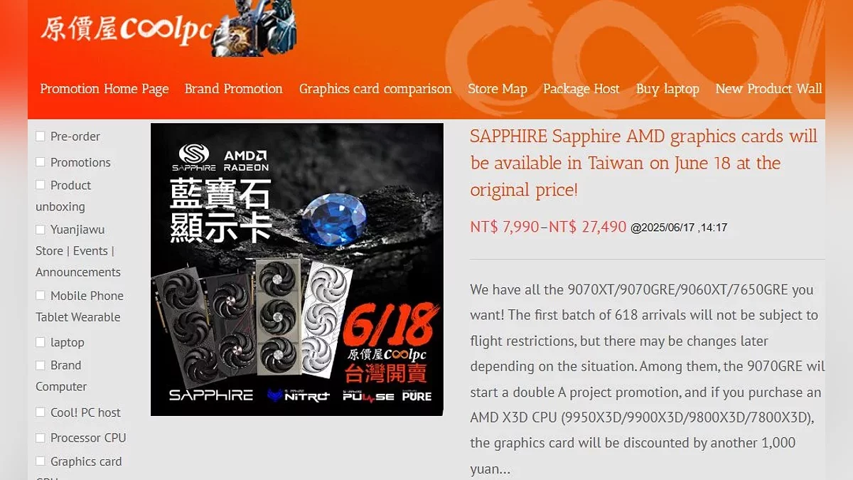 Эксклюзивность видеокарты AMD Radeon RX 9070 GRE для Китая оказалась недолгой, модель потихоньку появляется в продаже на Тайване. Как сообщают, первыми карту предложит производитель Sapphire. Пока анонсировано всего четыре варианта исполнения. Интересно, что другие партнеры AMD пока хранят молчание относительно своих планов на RX 9070 GRE.