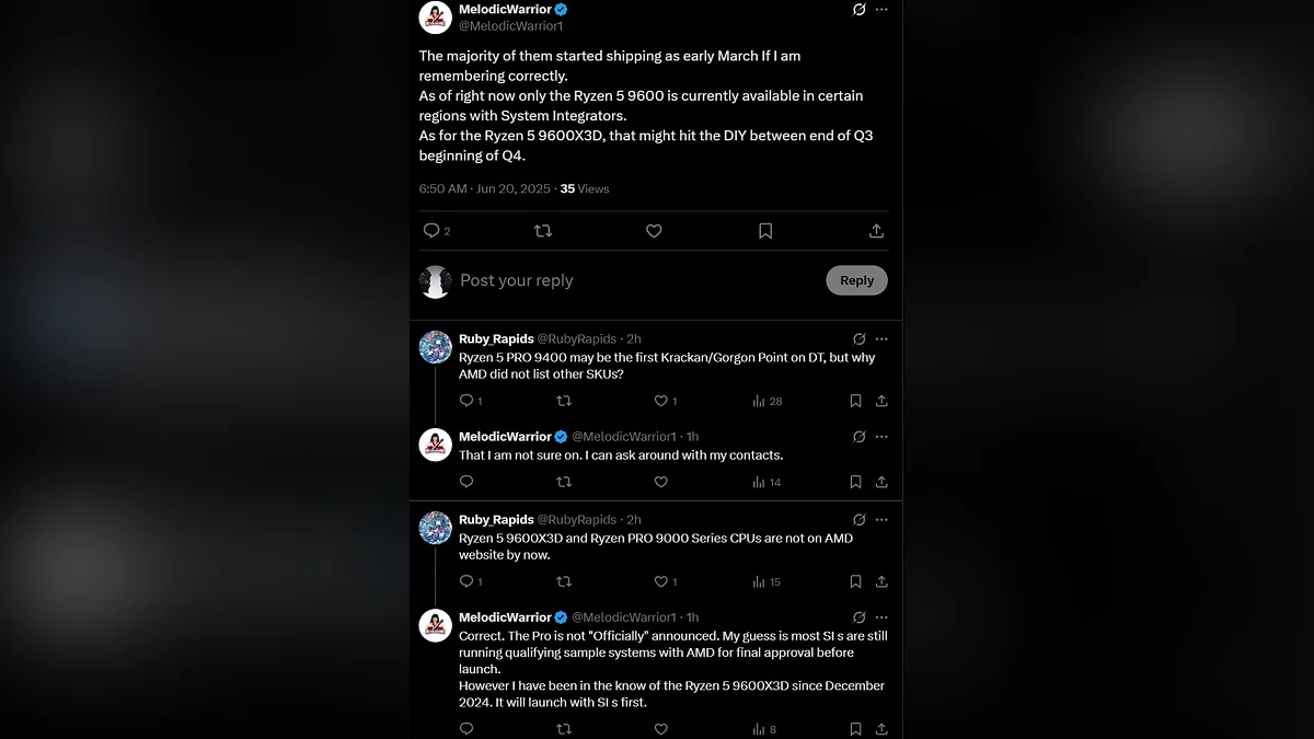 Ожидается, что новые процессоры, в частности Ryzen 5 9600X3D, появятся во второй половине 2025 года, а в свободную розничную продажу могут поступить ближе к концу лета или началу осени. Официальных комментариев от AMD относительно этих упоминаний пока не поступало.