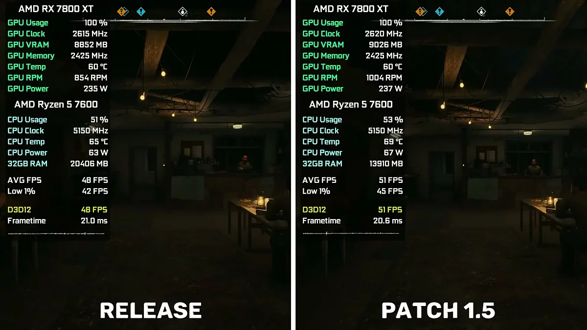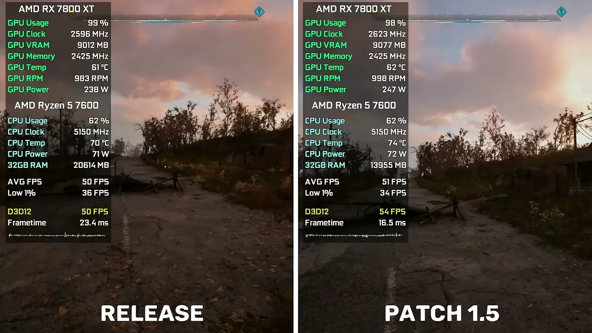 Ютубер 54 FPS тоже решил протестировать обновление. В его ролике можно увидеть сравнение релизной версии с версией 1.5. Игра запускалась на видеокарте AMD Radeon RX 7800 XT.