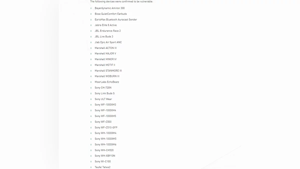Исследователи безопасности из немецкой компании ERNW обнаружили три уязвимости в Bluetooth-чипах Airoha, используемых в популярных беспроводных наушниках и колонках. Проблемы затрагивают десятки моделей Sony, JBL, Marshall, Bose, Jabra и других брендов.