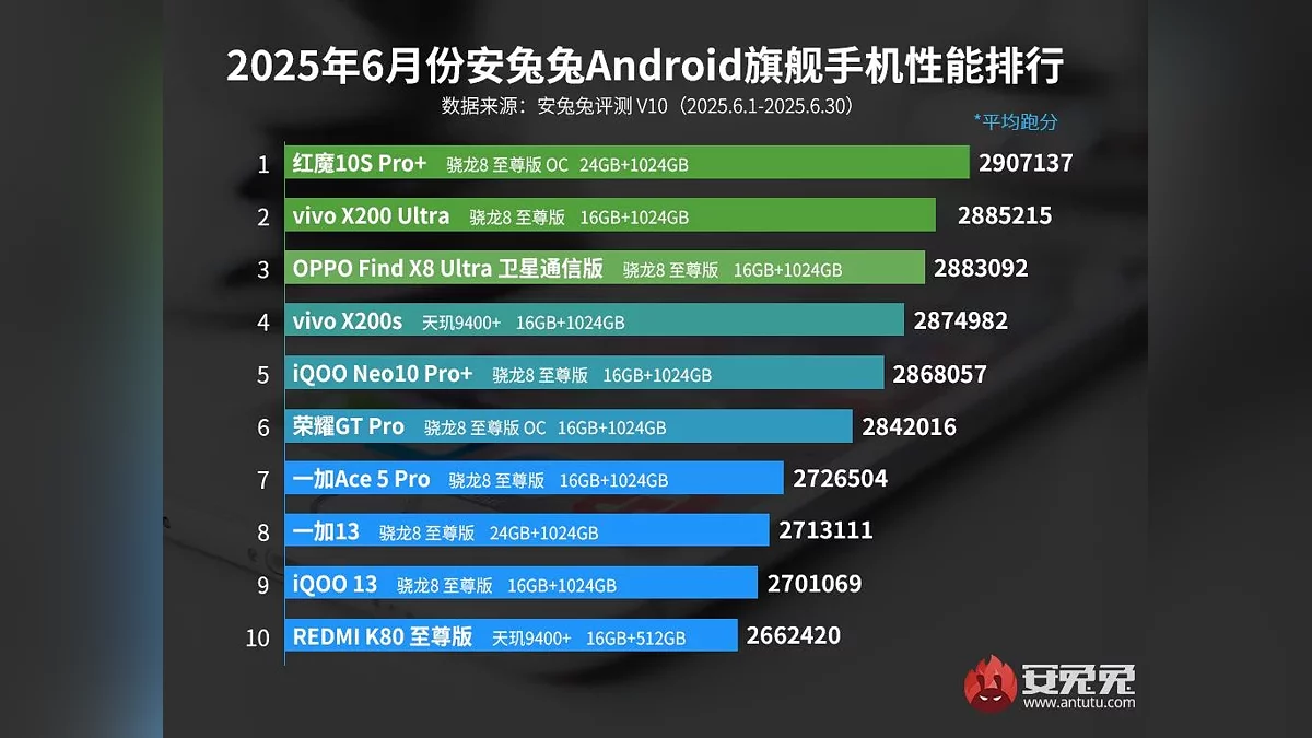 Nubia RedMagic 10S Pro+ подтвердил статус самого мощного, набрав в среднем 2 907 137 баллов. Его преимущество обеспечил разогнанный процессор Snapdragon 8 Elite и 24 ГБ оперативной памяти. vivo X200 Ultra занял второе место (2 885 215 баллов), также используя Snapdragon 8 Elite, но с 16 ГБ ОЗУ. OPPO Find X8 Ultra замкнул тройку лидеров с результатом 2 883 092 балла на той же платформе Snapdragon 8 Elite.