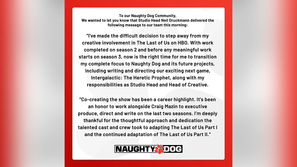 В своём сообщении, опубликованном в X (Twitter), Нил Дракманн рассказал, что работа над сериалом стала одним из самых ярких моментов в его карьере. Он поблагодарил актёров и съёмочную группу, а также отметил, что для него было честью работать вместе с Крейгом Мейзином (Craig Mazin). Геймдизайнер заявил, что решил «полностью переключить внимание на Naughty Dog и ее будущие проекты, включая написание сценария и режиссуру Intergalactic: The Heretic Prophet, а также на свои обязанности в качестве руководителя студии и главы творческого отдела».