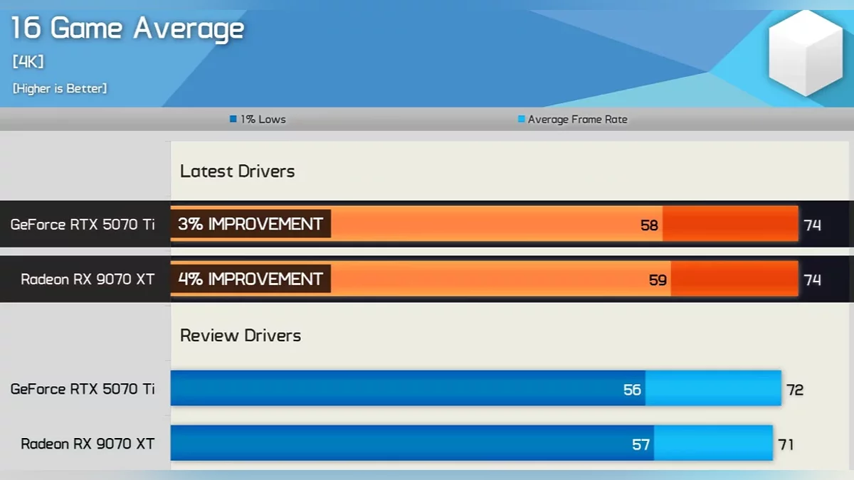 В разрешении 4K прирост RX 9070 XT был скромнее (+4%), а RTX 5070 Ti улучшилась на +3%. В итоге карты показали практически идентичную производительность в 4K. Тесты проводились без трассировки лучей и технологий масштабирования — в этих сценариях RTX 5070 Ti традиционно сохраняет преимущество.