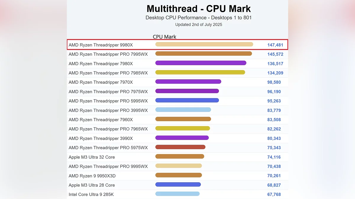 Указанные результаты являются ранними и основаны на одном тестовом образце. Окончательная производительность и энергопотребление розничных процессоров могут незначительно отличаться. Таким образом, Threadripper 9980X закономерно занимает верхнюю строчку в рейтинге PassMark для настольных CPU. Его реальные возможности в профессиональных приложениях станут полностью ясны после независимых тестов розничных образцов.