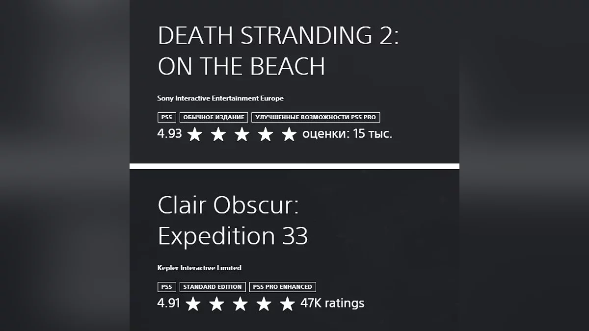 Французская RPG Clair Obscur: Expedition 33 потеряла звание самой высокооценённой игры в сервисе PlayStation Store. Теперь оно принадлежит Death Stranding 2: On The Beach.