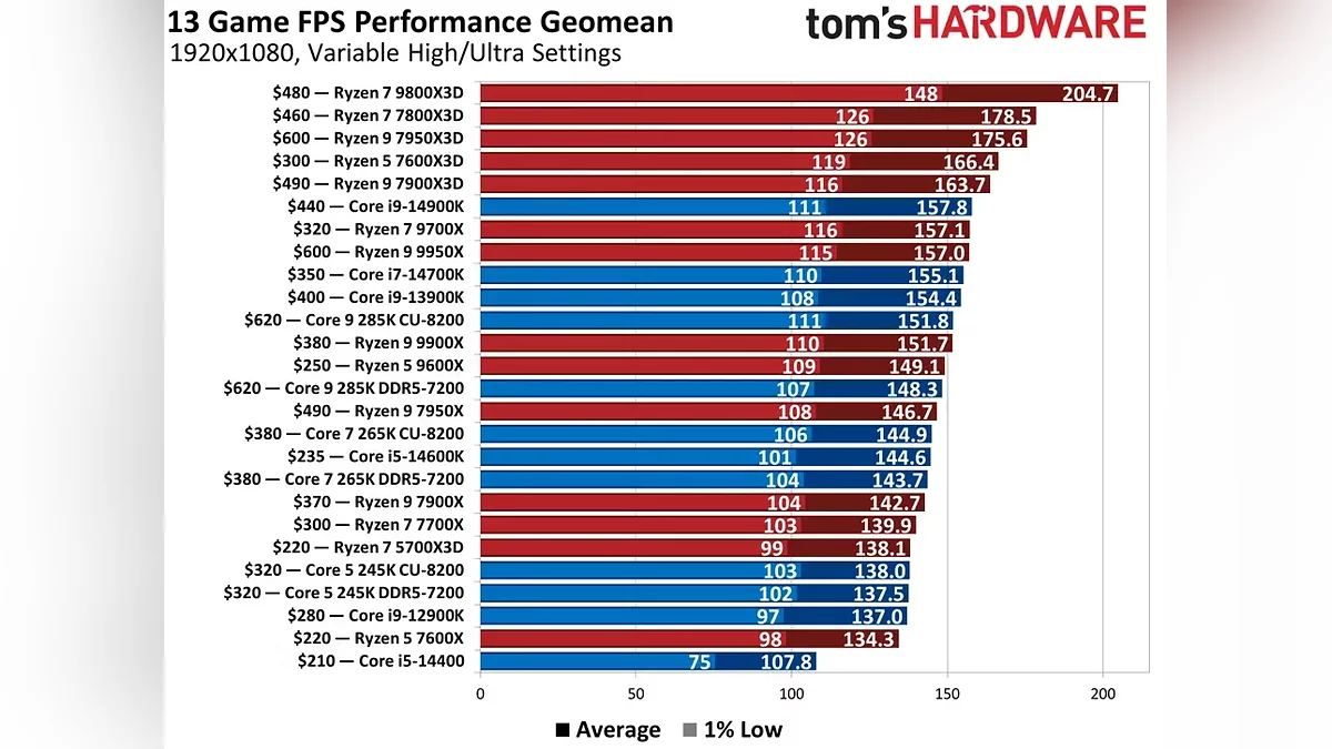 Лидером в игровых тестах стал AMD Ryzen 7 9800X3D. При цене от $480 (около 38 000 рублей) он демонстрирует до 35% преимущества перед топовыми Intel Core Ultra 9 285K в разрешении 1080p. Более дорогой Ryzen 9 9950X3D — $699 (около 55 000 рублей)) прибавляет лишь несколько процентов FPS, что не оправдывает разницу в стоимости для большинства геймеров.