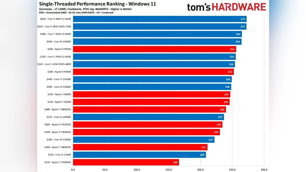 Новые тесты процессоров от Tom's Hardware выявили лидера в однопоточной производительности. Intel Core Ultra 9 285K обошёл все современные ЦПУ, включая топовые AMD Ryzen 9000 и предыдущие флагманы Intel, используя обычную оперативную память DDR5-7200. Примечательно, что результат почти не уступает показателям с дорогой DDR5-8200.