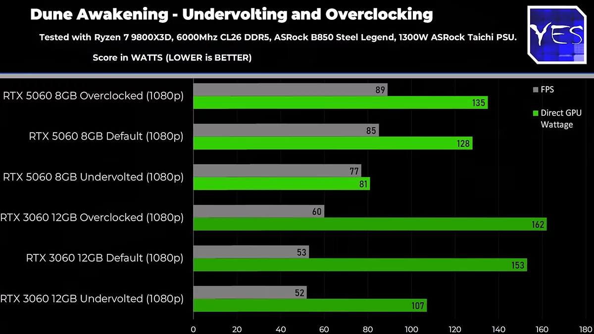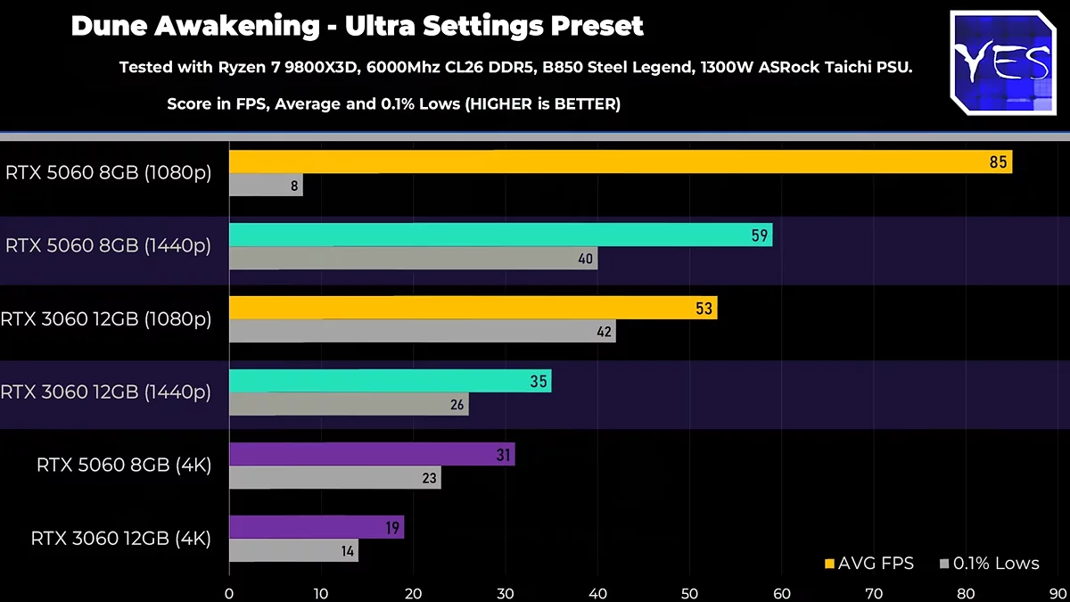 Несмотря на то, что RTX 5060 показывает более высокие средние FPS в большинстве современных игр, особенно на разрешениях 1440p и 4K, реальное игровое поведение карты оставляет желать лучшего. Видеокарта страдает от сильных просадок производительности — показатель 0,1% Low местами катастрофически низкий. В той же Dune: Awakening при 1080p карта выдает около 8 кадров в самые тяжелые моменты, в то время как RTX 3060 стабильно держит около 40–45 FPS.