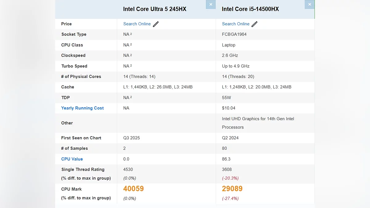 Мобильный чип Core Ultra 5 245HX обогнал десктопный Core Ultra 5 245 в PassMark