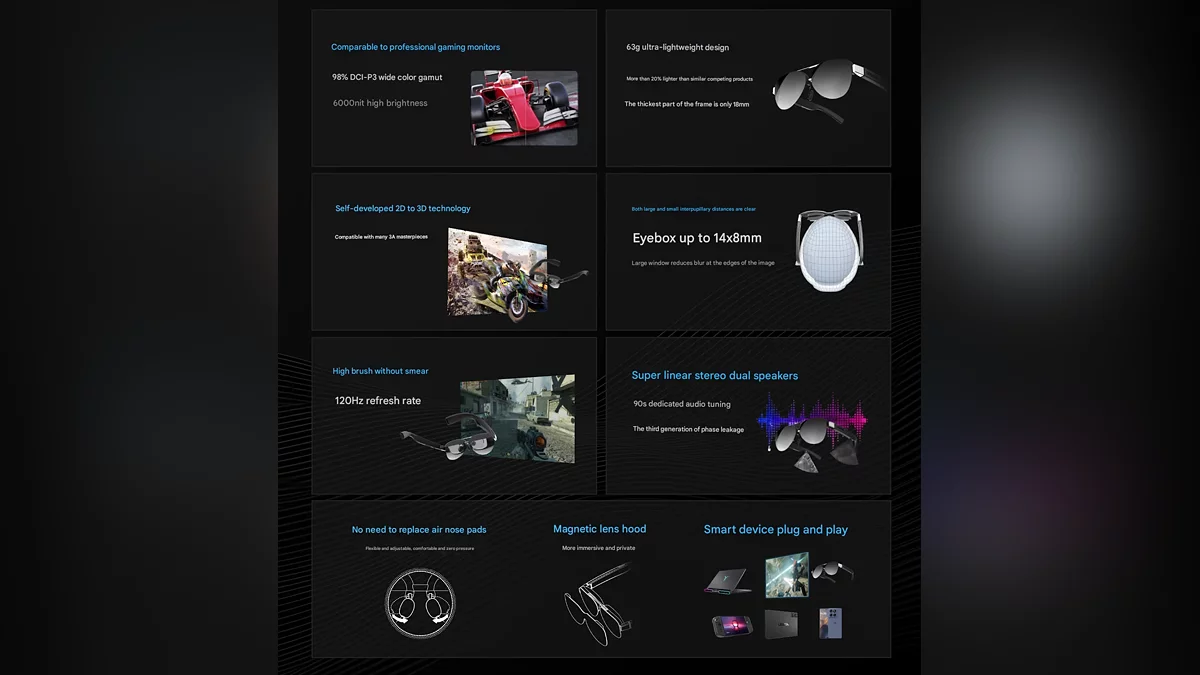 Главная особенность — встроенная технология преобразования 2D-изображения в 3D. Она работает напрямую с источниками сигнала (ПК, портативные консоли) в «многих AAA-играх» без необходимости установки дополнительного ПО. Встроена акустическая система с двумя динамиками, направляющими звук к ушам пользователя. Вес очков составляет 63 грамма, а конструкция включает регулировку посадки, магнитные крепления для сменных диоптрийных линз и носовые упоры для индивидуальной подгонки.
