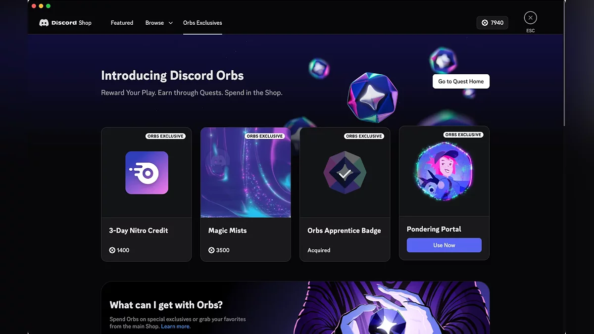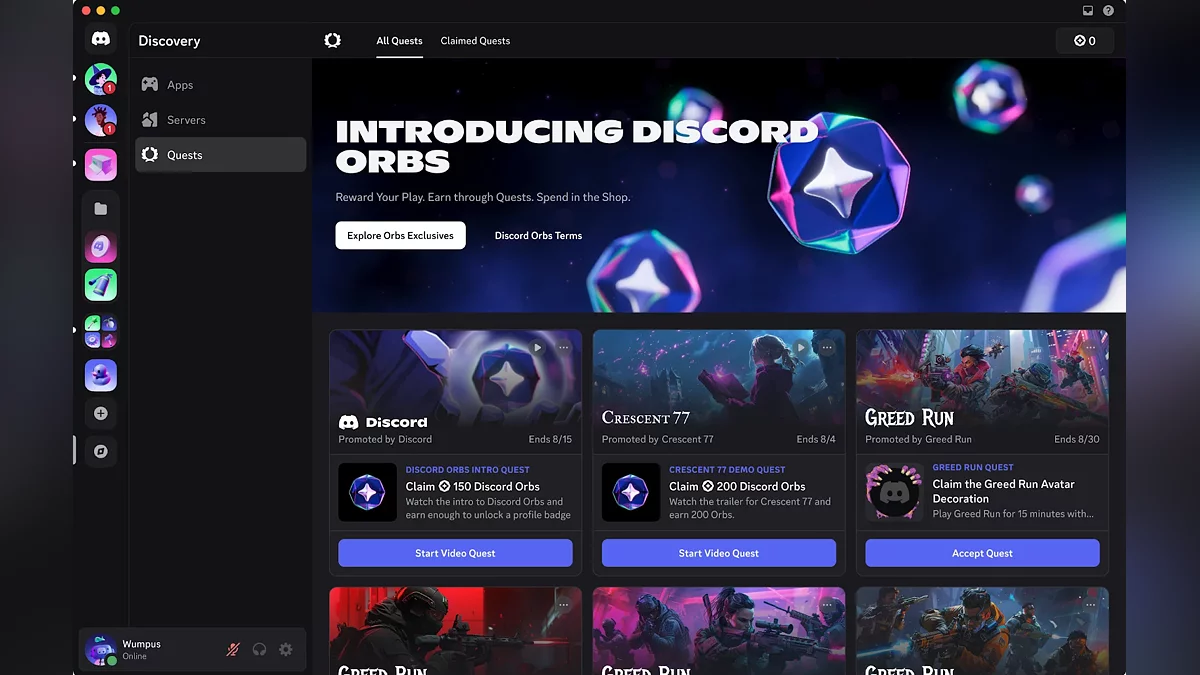 Главная задача Orbs — дать пользователям новый способ получать цифровые бонусы. Заработать валюту можно, выполняя специальные задания внутри Discord. Обычно это простые действия: просмотр трейлера игры, запуск определенного приложения или взаимодействие с промо-материалами партнеров платформы. Список доступных квестов появляется во вкладке «Магазин».