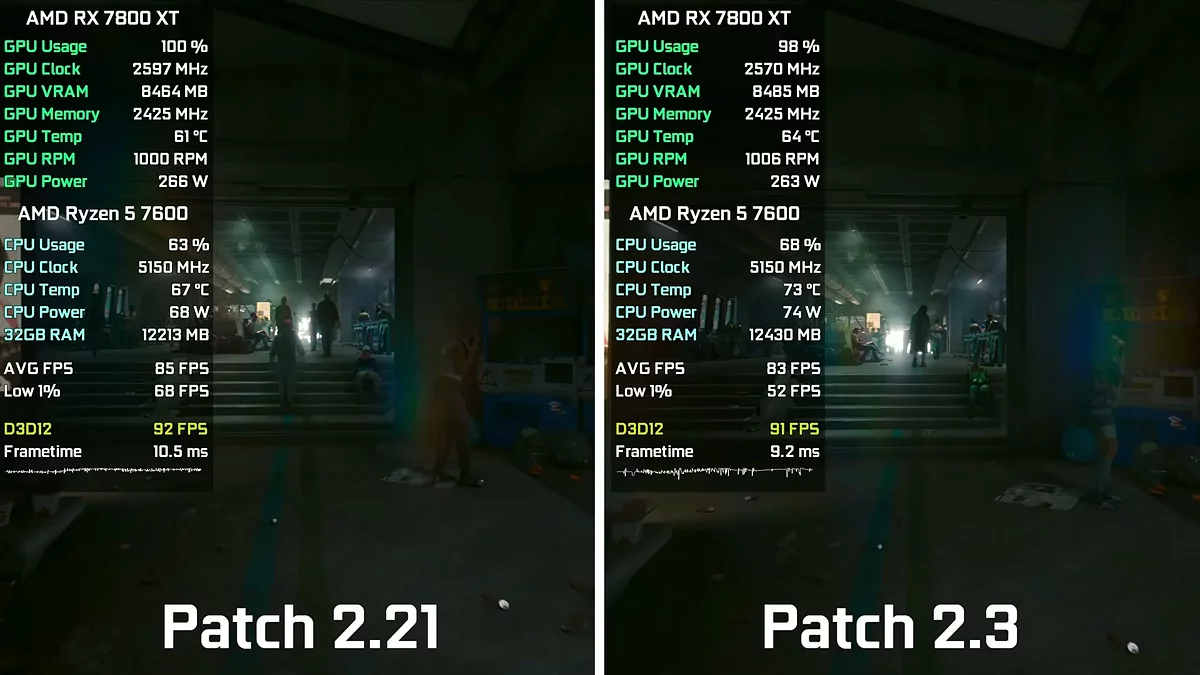 В ролике энтузиаст сравнил версии 2.21 и 2.3, запущенные на PC с операционной системой Windows 10, процессором AMD Ryzen 5 7600, видеокартой AMD Radeon RX 7800 XT (16 Гб), 32 Гб оперативной памяти DDR5 и SSD. Судя по видео, обновление не повлияло на частоту кадров.
