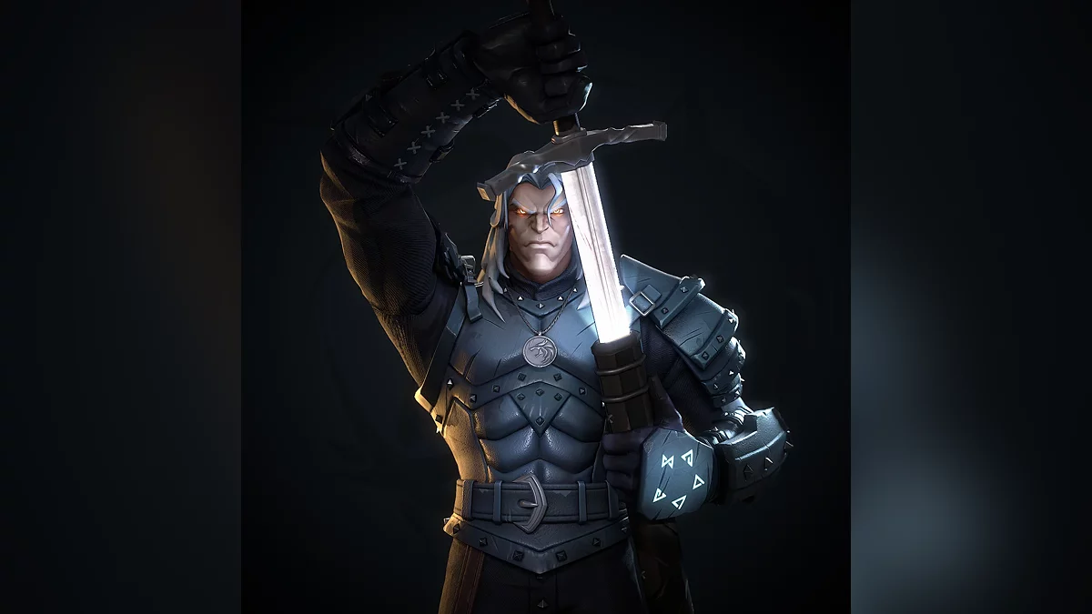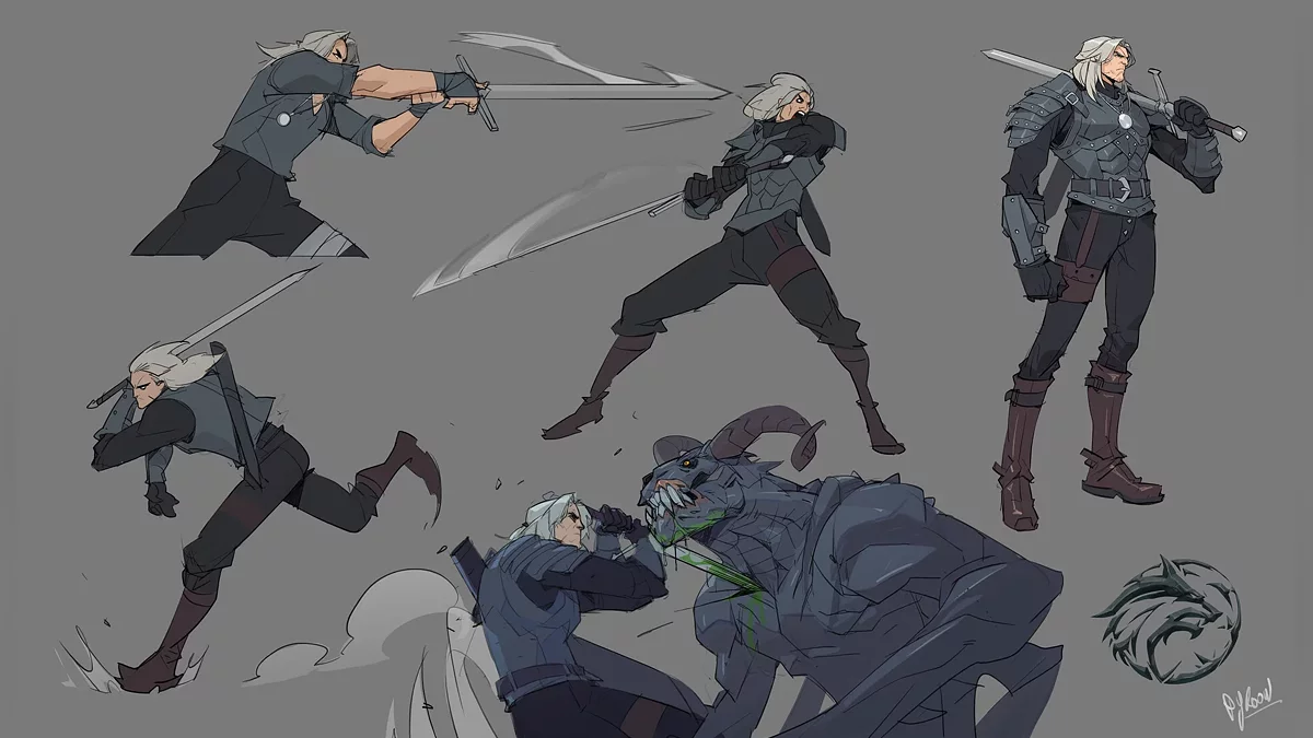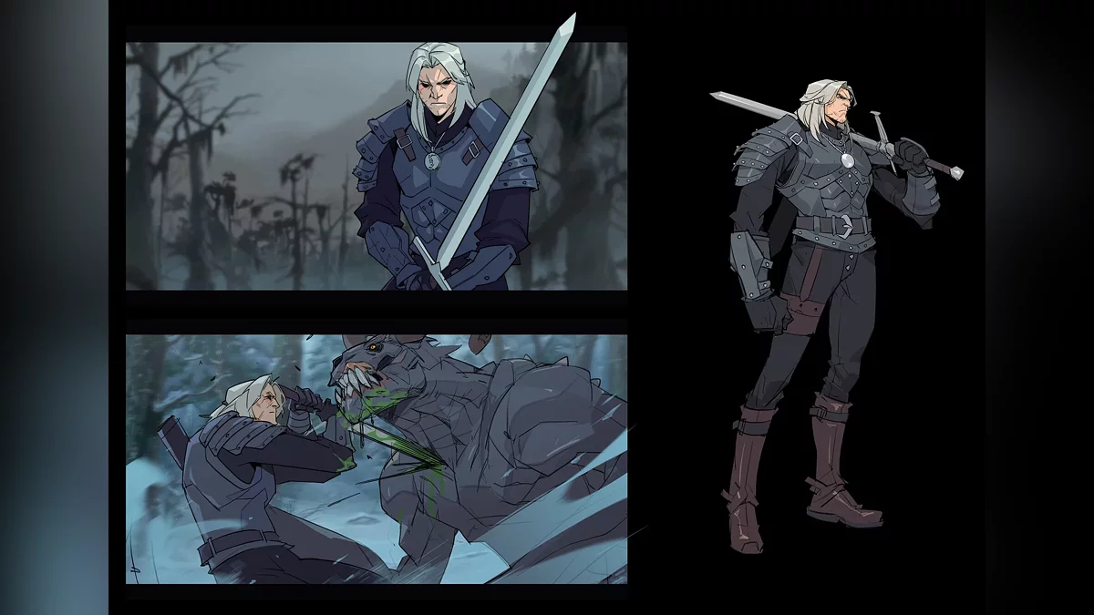 Художник гипертрофировал черты охотника на чудовищ и переработал доспехи, которые можно было увидеть во втором сезоне «Ведьмака». Его Геральт стал более массивным и потерял сходство с Генри Кавиллом (Henry Cavill), а также обзавёлся металлическими наручами со Знаками из игр CD Projekt RED и шипами. Одна из поз прямо отсылает к постерам The Witcher 3: Wild Hunt.