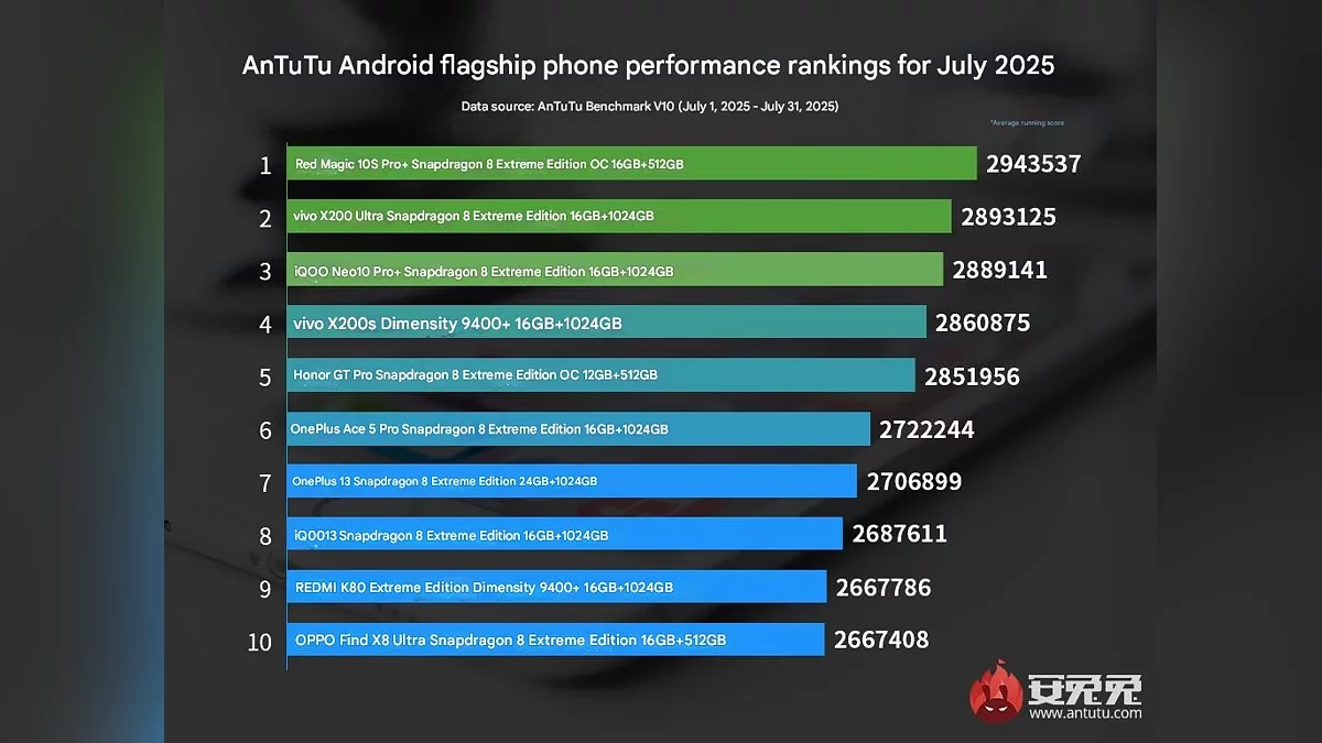 Данные основаны на средних показателях (не пиковых) множества тестов, проведенных реальными пользователями через приложение Antutu в Китае с 1 по 31 июля 2025 года. Для попадания в рейтинг модель должна набрать не менее 1000 успешных запусков бенчмарка за месяц.