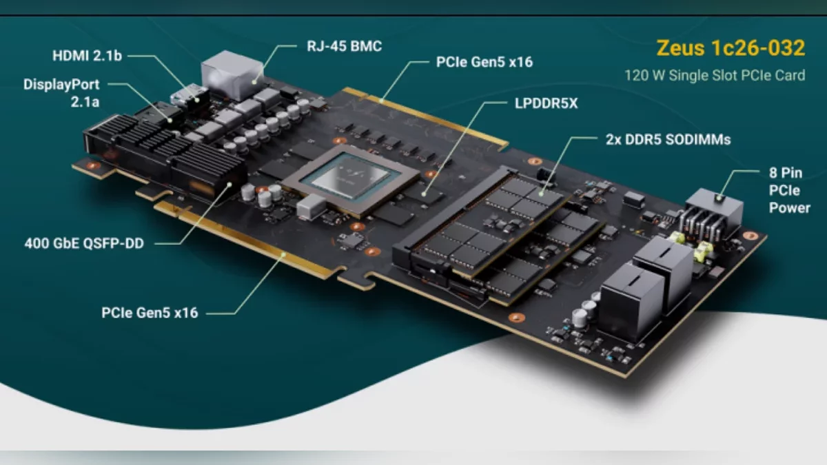 Карта получит 2 или 4 слота для SO-DIMM DDR5. Пользователи смогут самостоятельно увеличивать объем памяти вплоть до 384 ГБ, что беспрецедентно для видеокарт. Bolt утверждает, что в «предкремниевых тестах» Zeus демонстрирует десятикратное преимущество перед GeForce RTX 5090 в рендеринге с трассировкой лучей в 4K. При таких характеристиках заявлено потребление всего 120 Вт через один 8-контактный разъем PCIe. Также заявлена поддержка HDMI, DisplayPort, PCIe Gen5, высокоскоростного сетевого порта 400GbE и даже RJ45 на самой карте.